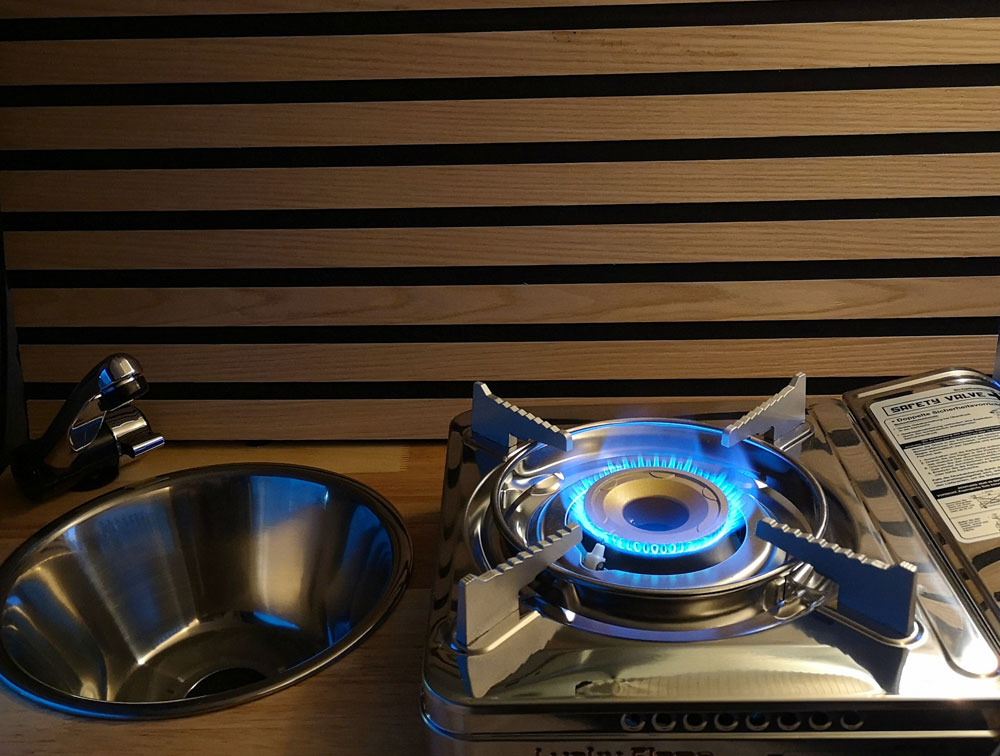 Die Mini Küche lässt sich einfach verschieben und auch als Außen Küche benutzen .