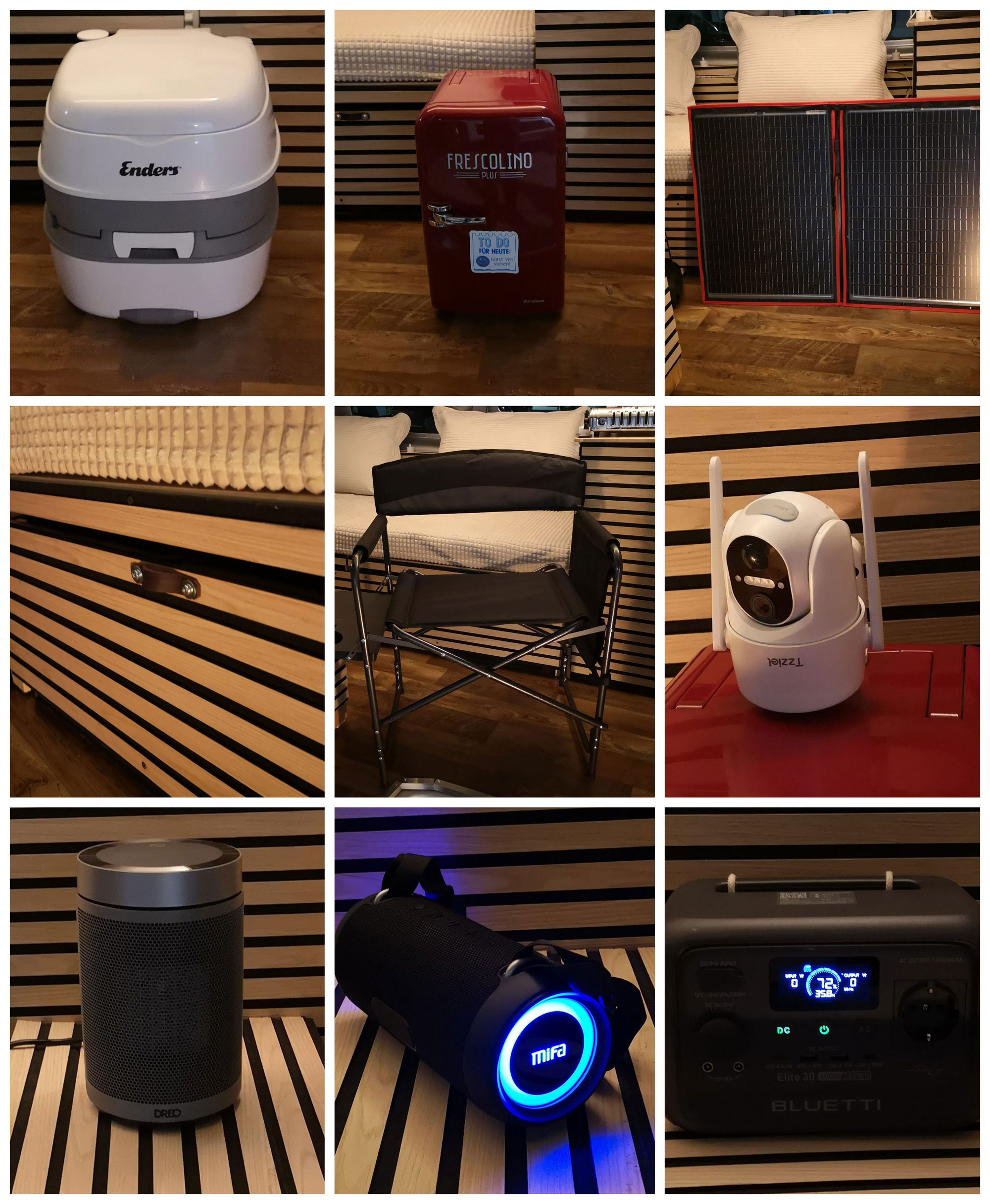 Noch einige Gedanken von mir : Eine aufwendige Elektrik mit teuren schweren Batterien, Wechselrichter , FI Sicherungen, Kabeln ist , wenn nicht von einem Elektriker installiert, unsicher und kann eine Brandgefahr darstellen. Stattdessen nutze ich 2 kompakte mobile Powerstationen. Die sind preiswert, leicht und ich kann sie einfach mit nach Hause nehmen. Eine kleine Kompressor Kühlbox kann damit ein bis zwei Tage ohne Nachladen betrieben werden.